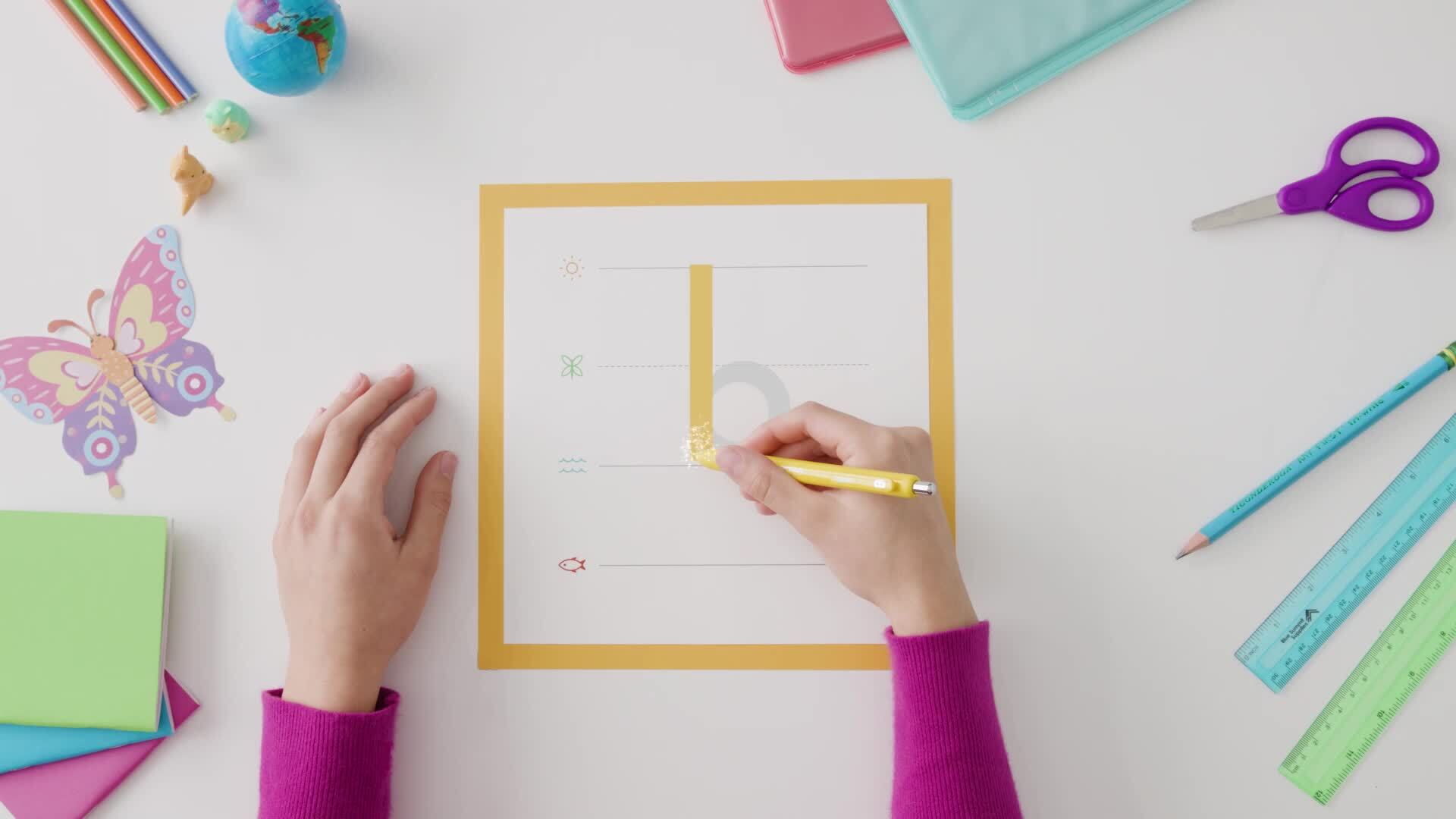 Guides students through simple tasks, manipulatives, and writing and letter formation—from a first-person perspective.